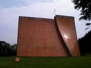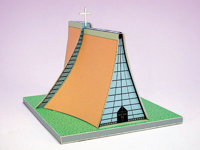 貼滿菱形琉璃瓦的四片曲面牆(亦是屋頂),組合起來烘托其上的十字架,屋脊部份分開,形成「一線天」的天窗。兩側邊窗逸入的光線,更增添一份神秘感。後二曲面高於前部,前方45度是最佳的觀看角度。